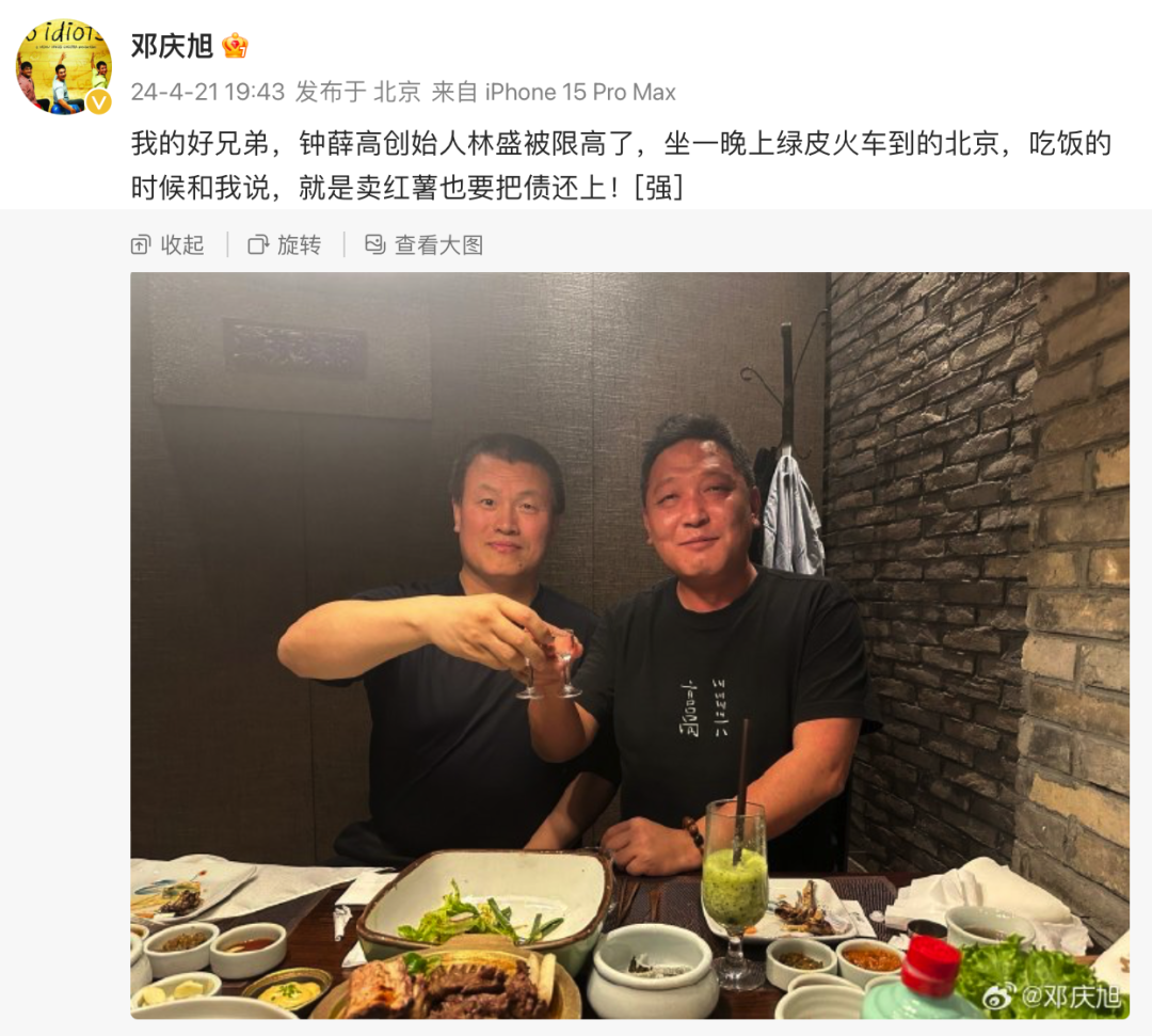 2024年4月21日,钟薛高创始人林盛在被“限高”后,坐一晚上绿皮火车来到北京,与新浪财经CEO邓庆旭共进晚餐。此事被后者发布在微博上,引发热议。