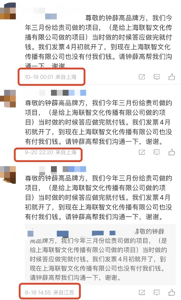 其中,一位自称钟薛高客服部门“前员工”的网友表示,在公司效益不好优化期间,该员工等6人与公司人事提出优化补偿,并签署了离职同意单,约定补偿金和工资10月15日发放,当天公司未履约。该员工讨要说法,“公司回复账户上没有钱补偿,说要等,没有具体的时间点。”