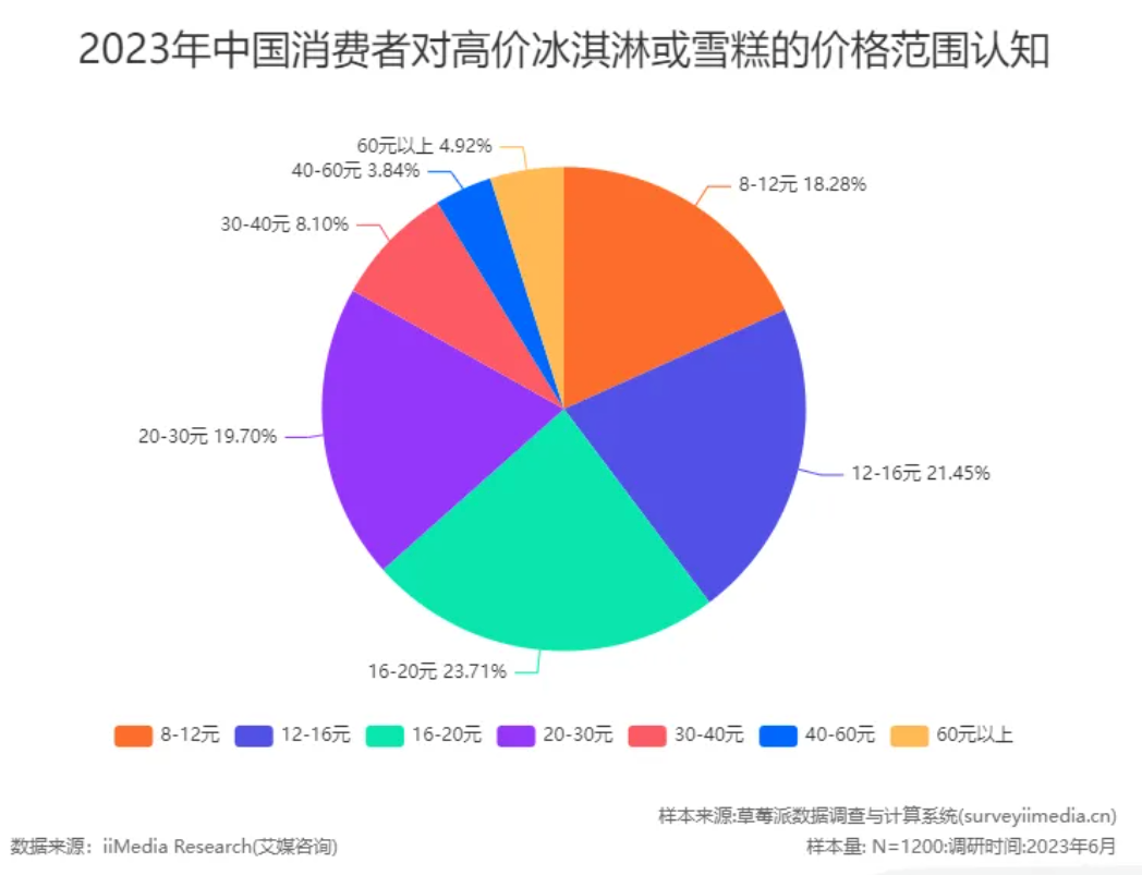 艾媒咨询“2023年中国消费者对高价冰淇淋或雪糕的价格范围认知”调查显示,在价格范围认知方面,消费者对高价冰淇淋或雪糕的价格接受范围较广,从8-20元的价格都有一定比例的消费者选择。其中,选择8-12元、12-16元、16-20元的消费者比例较高,分别为18.28%、21.45%、23.71%。