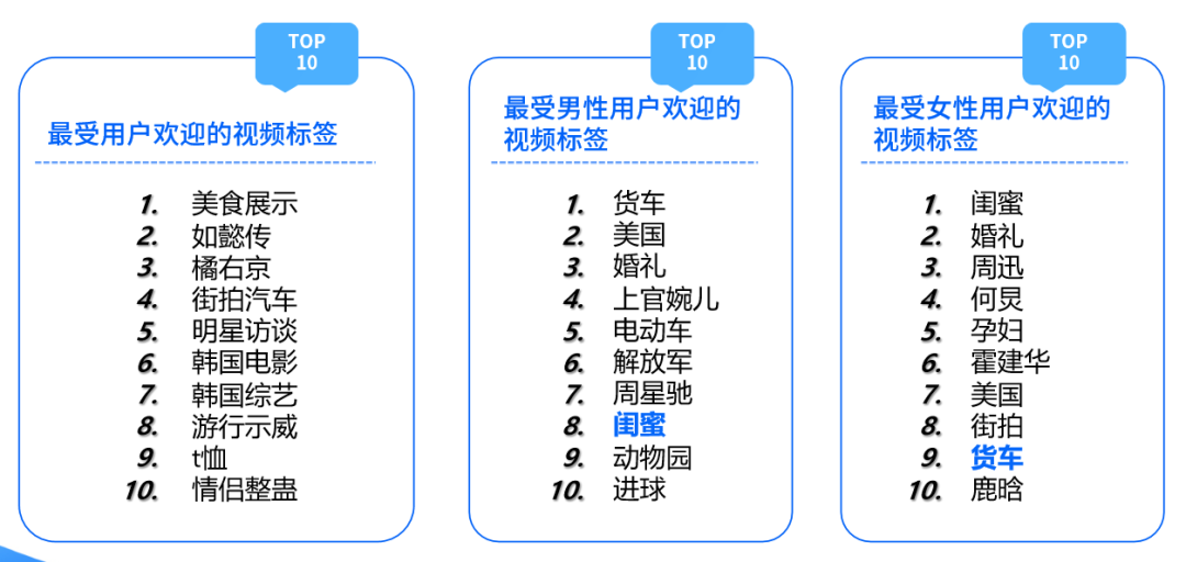 从时间分布来看,更多用户在14时-19时浏览影音相关内容,最受用户欢迎的视频标签前三分别是美食、电视剧、游戏,而且男性和女性用户的视频标签差异较大,男性居然关注闺蜜、女性关注货车。