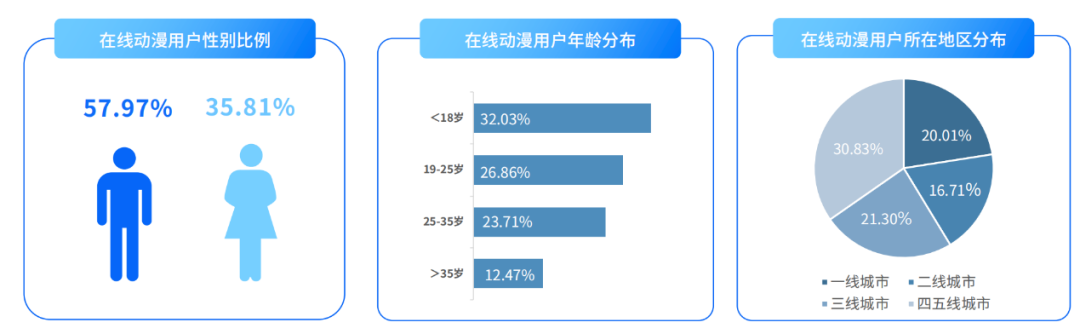 在线动漫:相对来讲,这个垂类行业领域,用户年轻化趋势更为明显,过半用户低于25岁,而且动漫爱好者分布广泛,不过更多聚集在三四五线城市。无疑适合广告主进行年轻化营销和抢占下沉市场。
