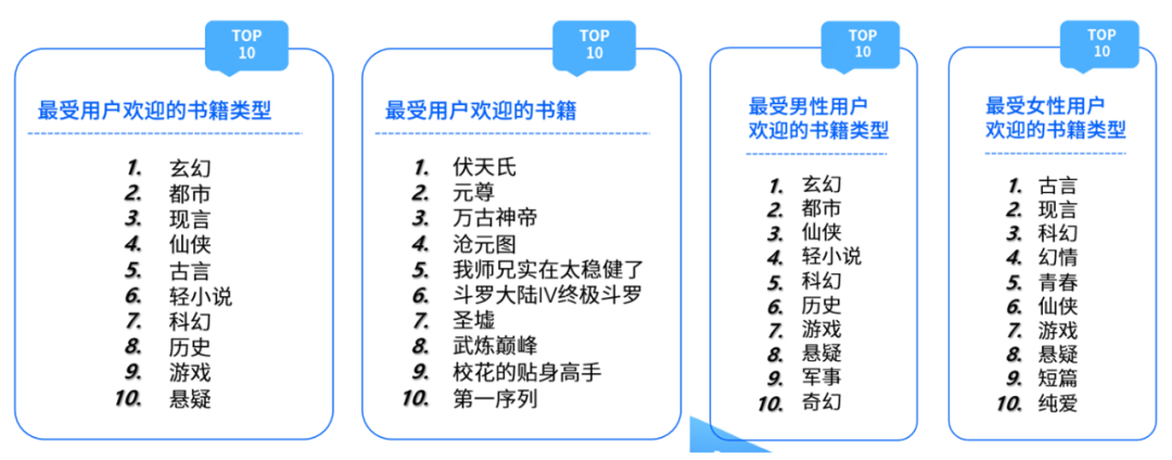 从内容上来看,玄幻、都市、现言小说成用户最爱,其中最受用户欢迎的前四位都是玄幻小说。