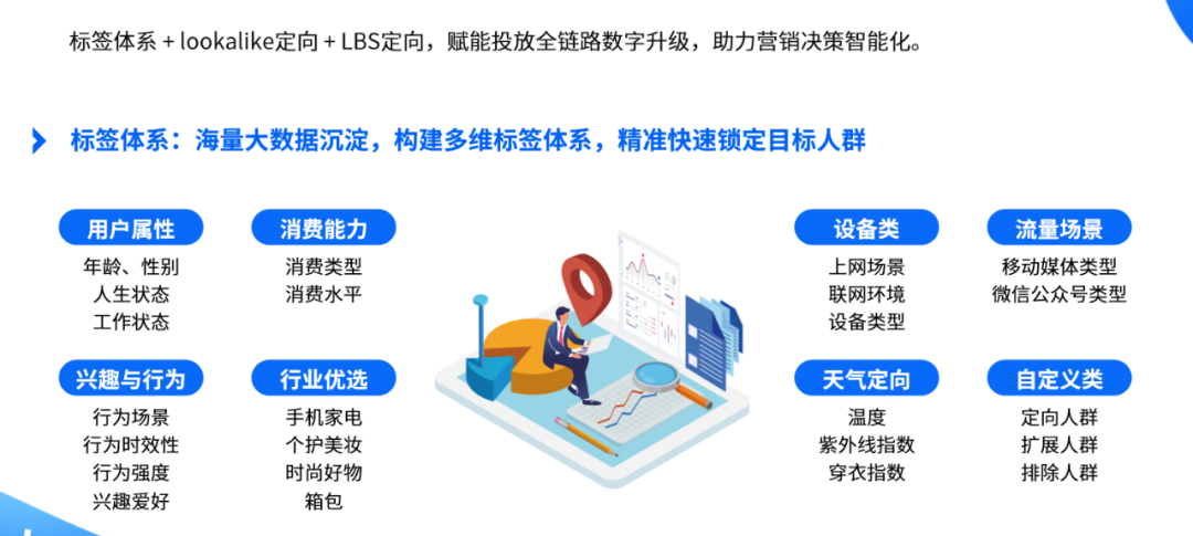 以腾讯看点举例来讲,通过标签体系+lookalike定向+LBS定向,赋能投放全链路数字升级,助力营销决策智能化,帮助广告主实现深度转化。
