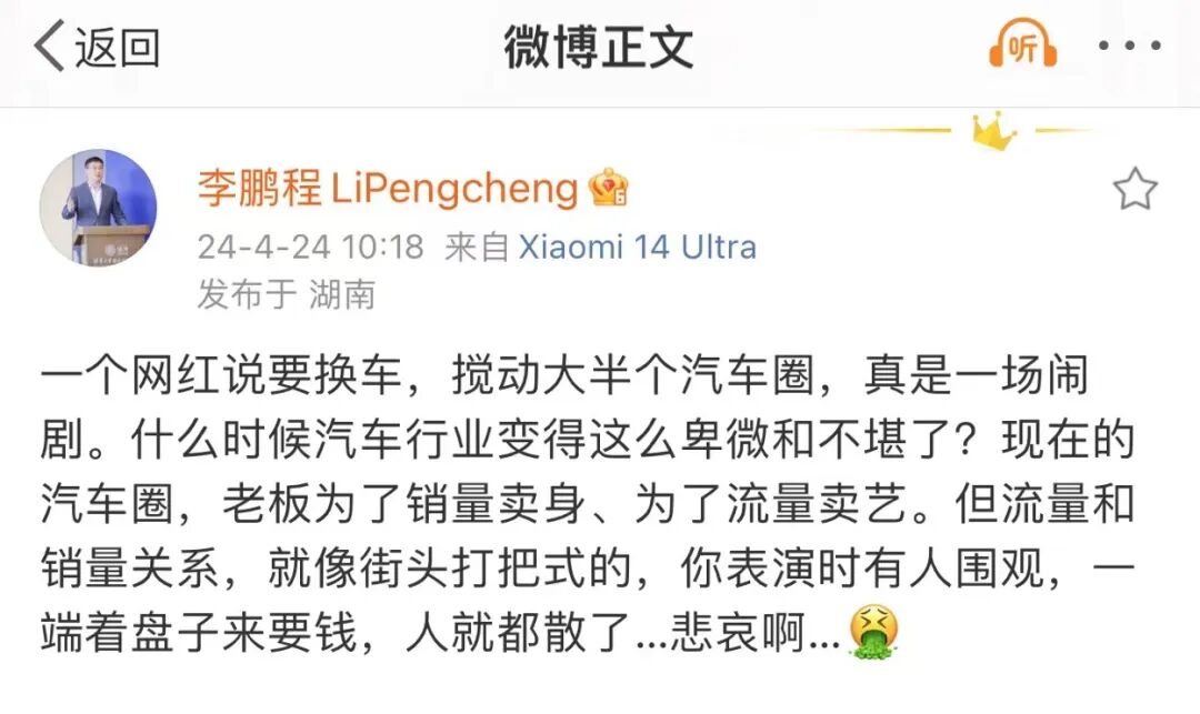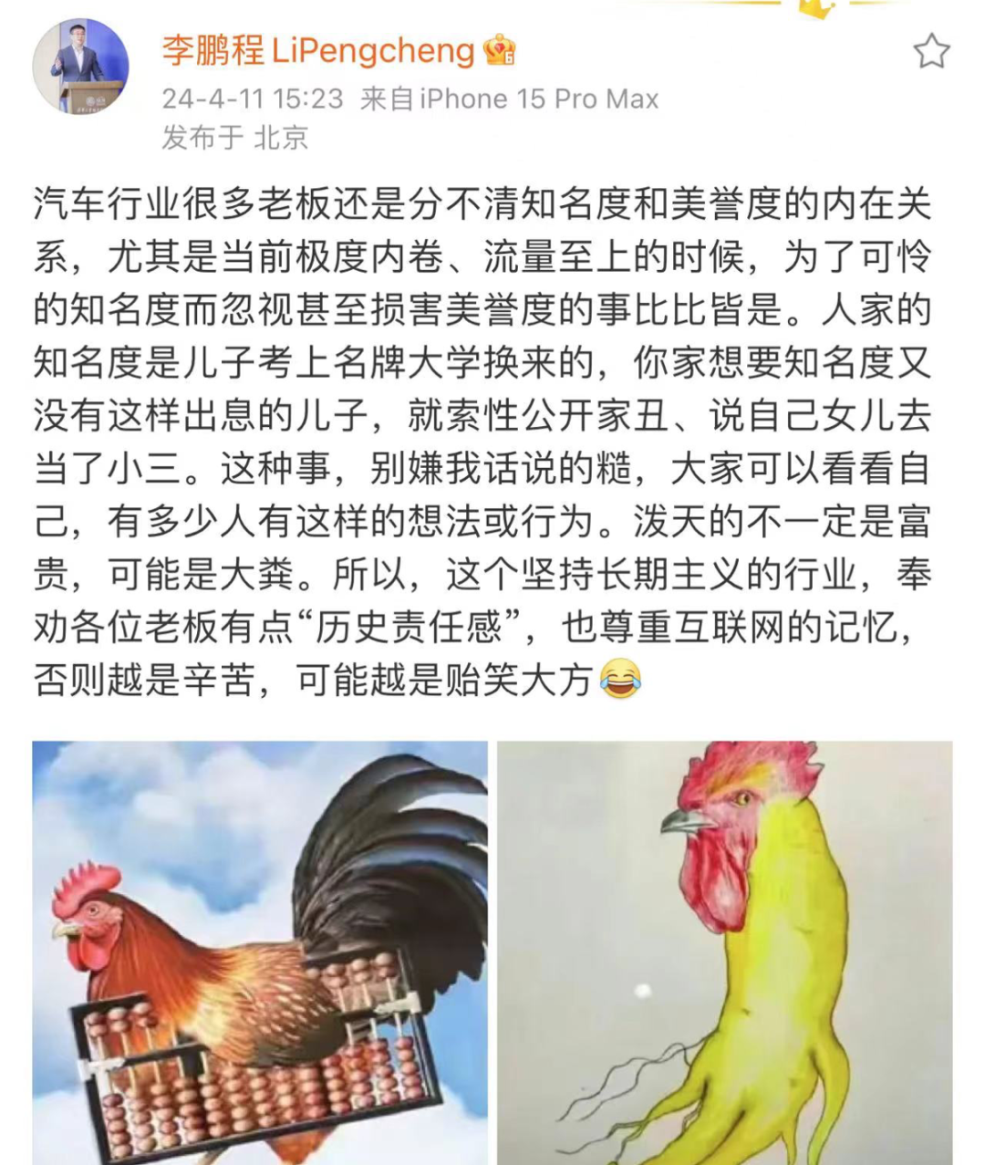 再翻看其微博,4月11日,也就是10多天前,当所有车圈大佬都纷纷开始学雷军,搞流量,当网红的时候,李鹏程就旗帜鲜明地提出了反对意见,他指出: