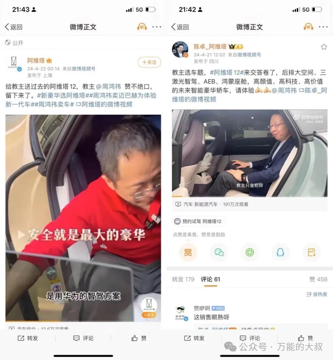 阿维塔不仅蹭了周鸿祎的流量,其年轻帅气的总裁@陈卓,还专门录了一个短视频,来向周鸿祎“推销”自己的“阿维塔12”!