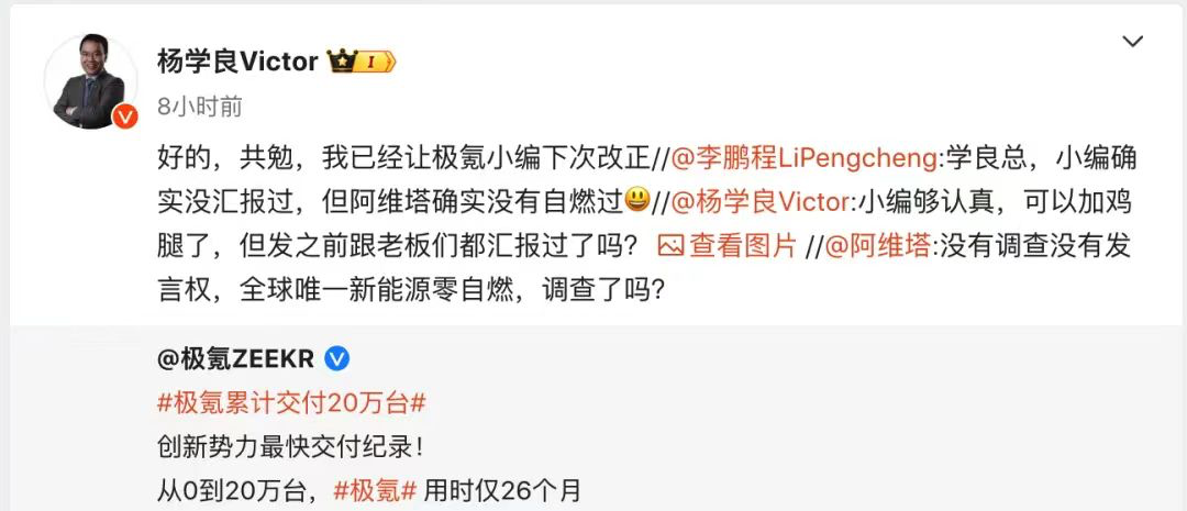 而在2024年1月8日,李鹏程还参与和极氪的公关战,与吉利副总裁杨学良“互动”。