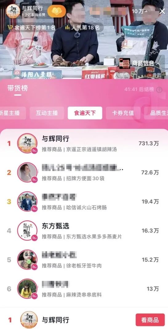 4月25日17:30—23:00,“与辉同行”直播间在洛阳应天门开启带货直播。有直播数据显示,当天直播间持续10万+人在线,直接冲入“食遍天下榜”第一名,三分钟内销售额就已经突破了百万!仅开播半小时,直播间销售额就已破千万,当晚“与辉同行”直播间冲上抖音带货总榜第一。