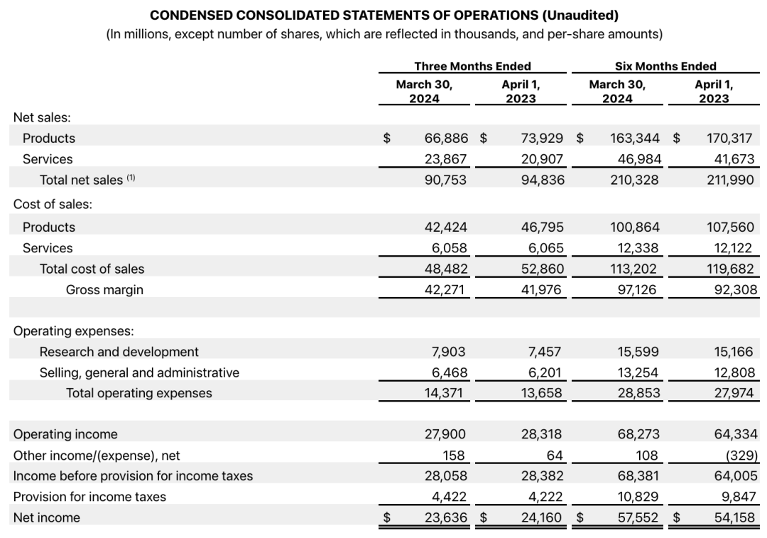 但与特斯拉一样,大涨的股价,也多多少少遮掩了苹果相对糟糕的一季度财报数据。2024年一季度,苹果收入为908亿美元,同比下降4%,净利润为236亿美元,同比下降2%。