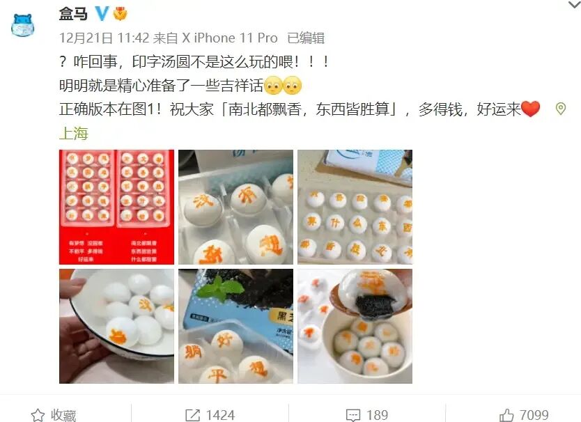 冬至时候,盒马推出过一款应景的文字汤圆,给用户增加节日氛围。