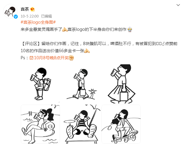 就在网友激烈讨论时,喜茶顺势发布logo设计征集,主动为网友提供创作素材,体现了品牌的格局和会玩的一面,品牌好感度upup。