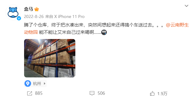 某年夏天盒马“送水”抽奖,放下豪言“体重多少就送你多少水!”,结果抽中的网友把机会让给了云南野生动物园,其园内的长颈鹿艾米体重已经达到960公斤……