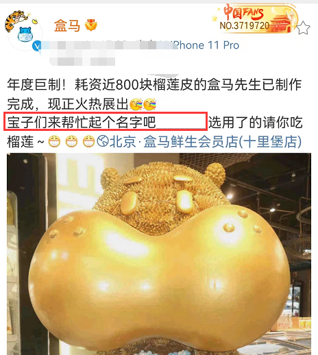 盒马给榴莲雪糕“同榴盒污”打广告,花了800多块榴莲皮,制作了一座金灿灿的巨型榴莲版盒马。