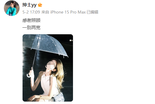 5月2日,小羽在社交媒体上发布一张雨中撑伞的图片,并配文“感谢照顾,一别两宽”,算是给这段本没有结果的恋情画上一个句号。
