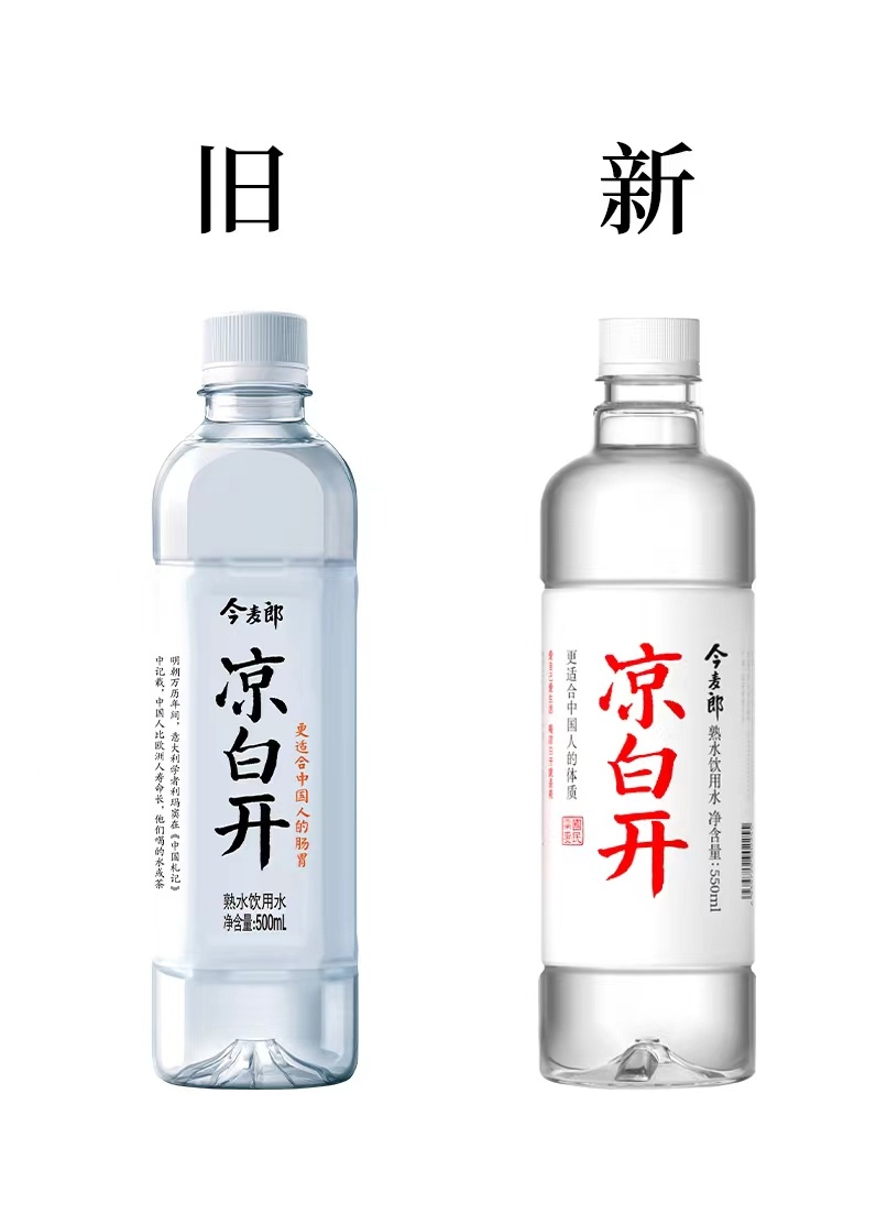 去年今麦郎找来知名包装设计师潘虎老师对凉白开的瓶身包装设计进行升级,黑字变红字,红字变黑字。