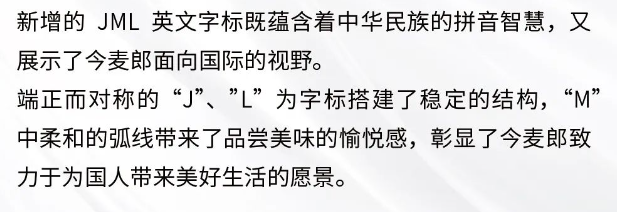作为一个30年的老品牌,“JML”其实并没有太大共识性(比如KFC就有共识性),所以英文的出现反而会削弱“今麦郎”三个字的品牌感。