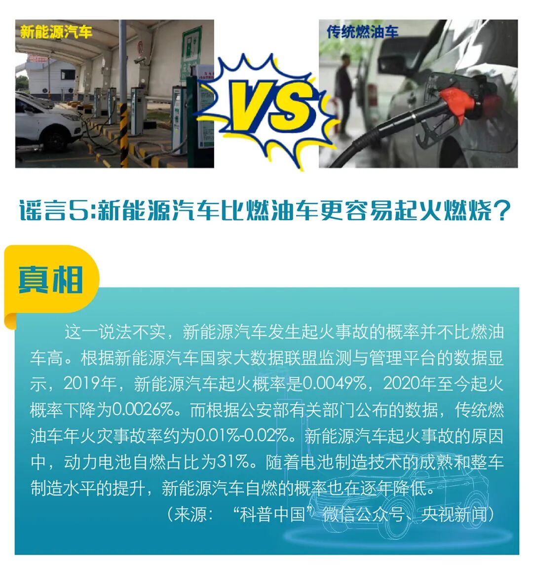 中国互联网联合辟谣平台公布的2023年新能源汽车行业辟谣榜,特地指出了新能源汽车起火率谣言,并给出了公安部数据,2020年国内新能源汽车起火率为0.0026%,其中电池自燃造成新能源汽车起火的概率仅为31%,燃油车火灾事故率约为0.01%~0.02%。
