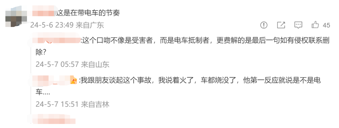 没有证据的情况下断定此次火灾是电动车引起,本身就是不科学的行为,目击事件的受害者,也没有证明自己的真实身份。有趣的是,这位“受害者家属”在文章的结尾特地加上了一句“以上为本人亲身经历后的体会,如有侵权请联系删除。”自己的体会,能侵权什么呢?