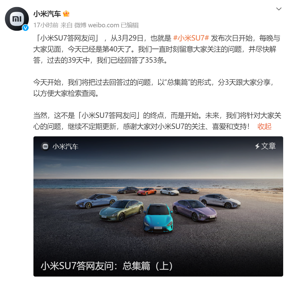 小米汽车自发布以来雷军以出镜讲解的方式回答用户的问题,截止北京时间5月8日该系列节目已经回答了353条网友提问,同样被视为汽车行业中典型的营销案例之一。