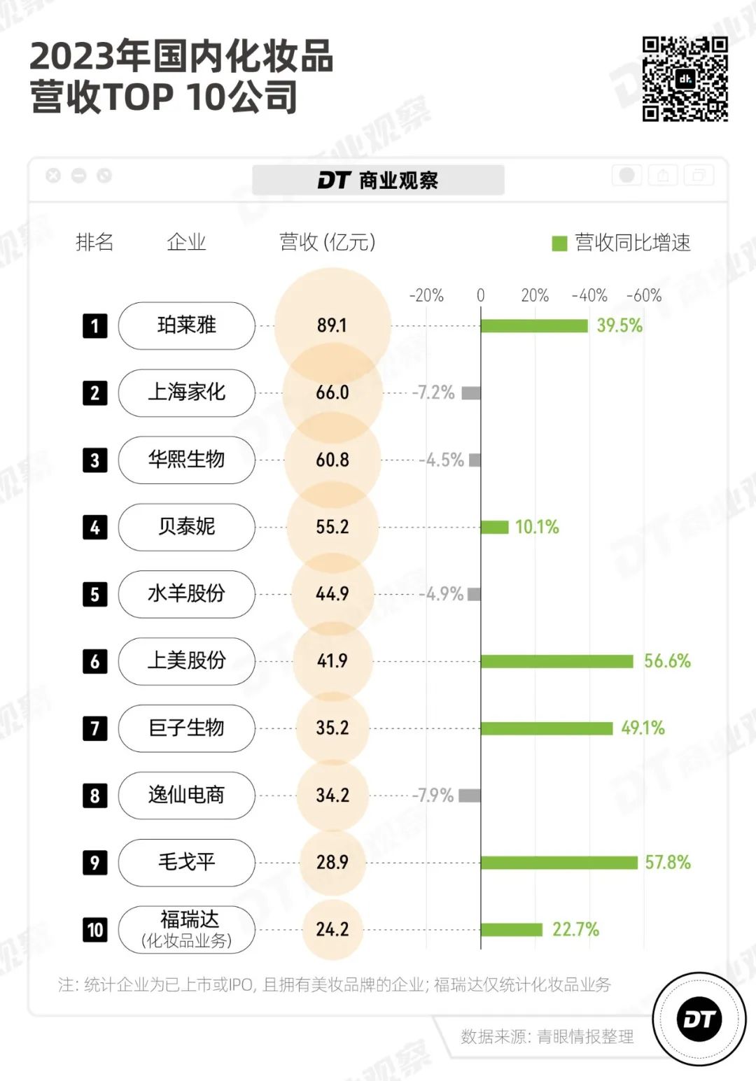 招股说明书显示,2023年毛戈平营收28.86亿人民币,在全国化妆品公司中排名第九,同比增速达到57.8%,领先前十名中的其他公司。