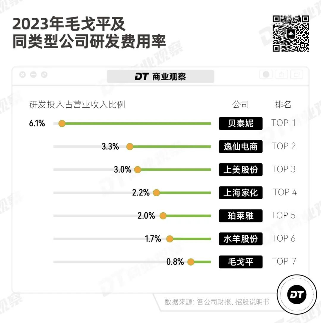 2023年,毛戈平的研发投入0.24亿元,占营业收入的比例为0.83%。同期,贝泰妮的研发费用率6.1%,逸仙电商3.3%,上美股份3.0%,都比毛戈平高出许多。