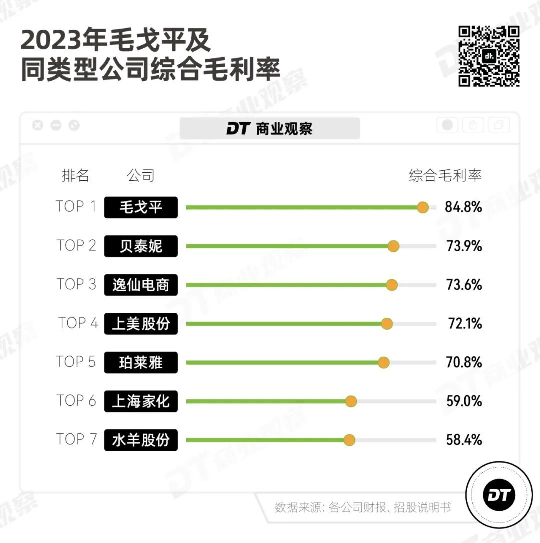 2023年,毛戈平的毛利率达到84.8%,高于逸仙电商、上美股份、珀莱雅等全国主要化妆品公司。
