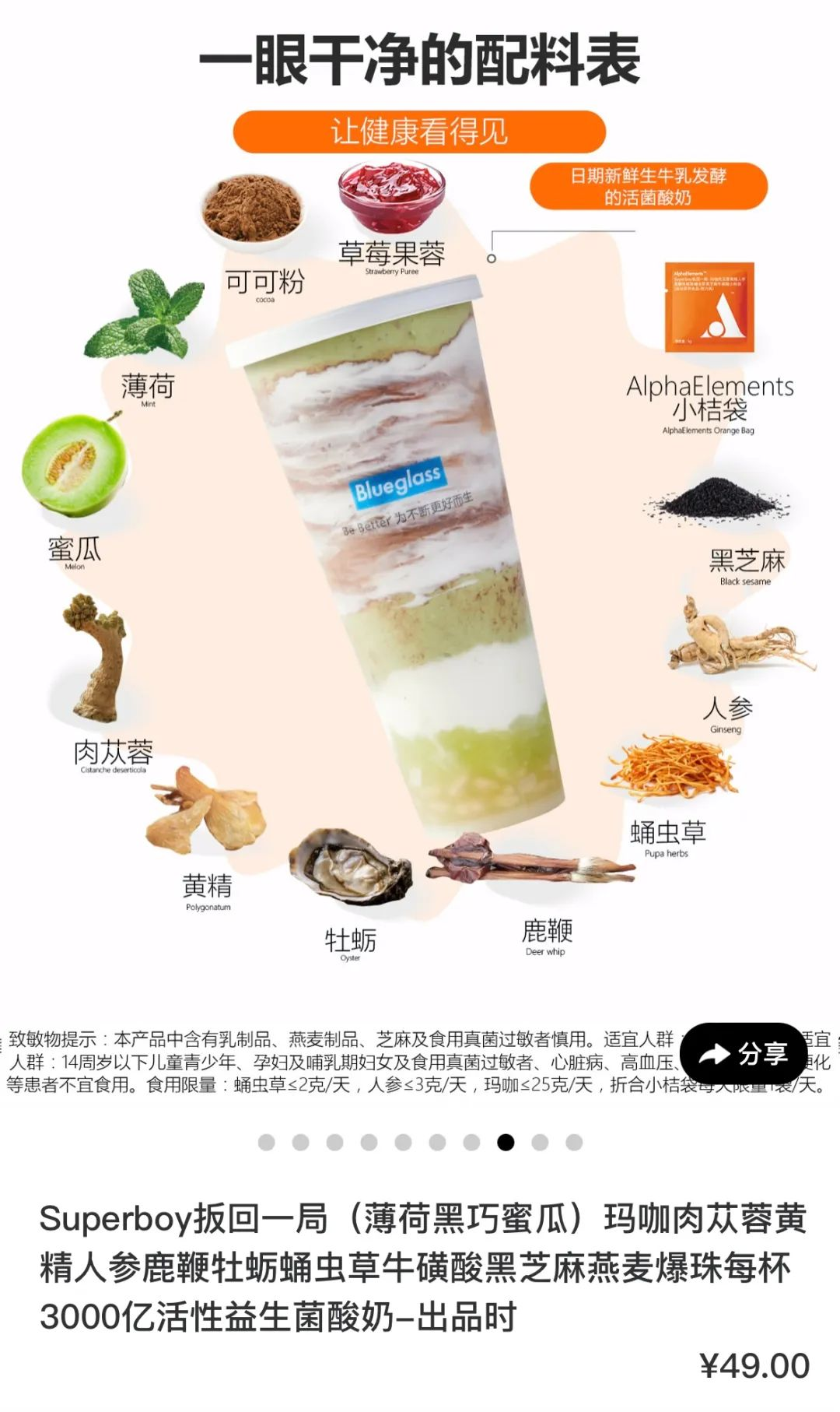 暗戳戳打出了“防猝死”、“壮阳”噱头,往酸奶里加人参、鹿鞭、牡蛎肽、蛹虫草、牛磺酸等,内含“3000亿活性益生菌”,堪比一杯酸奶基底的大全补品。
