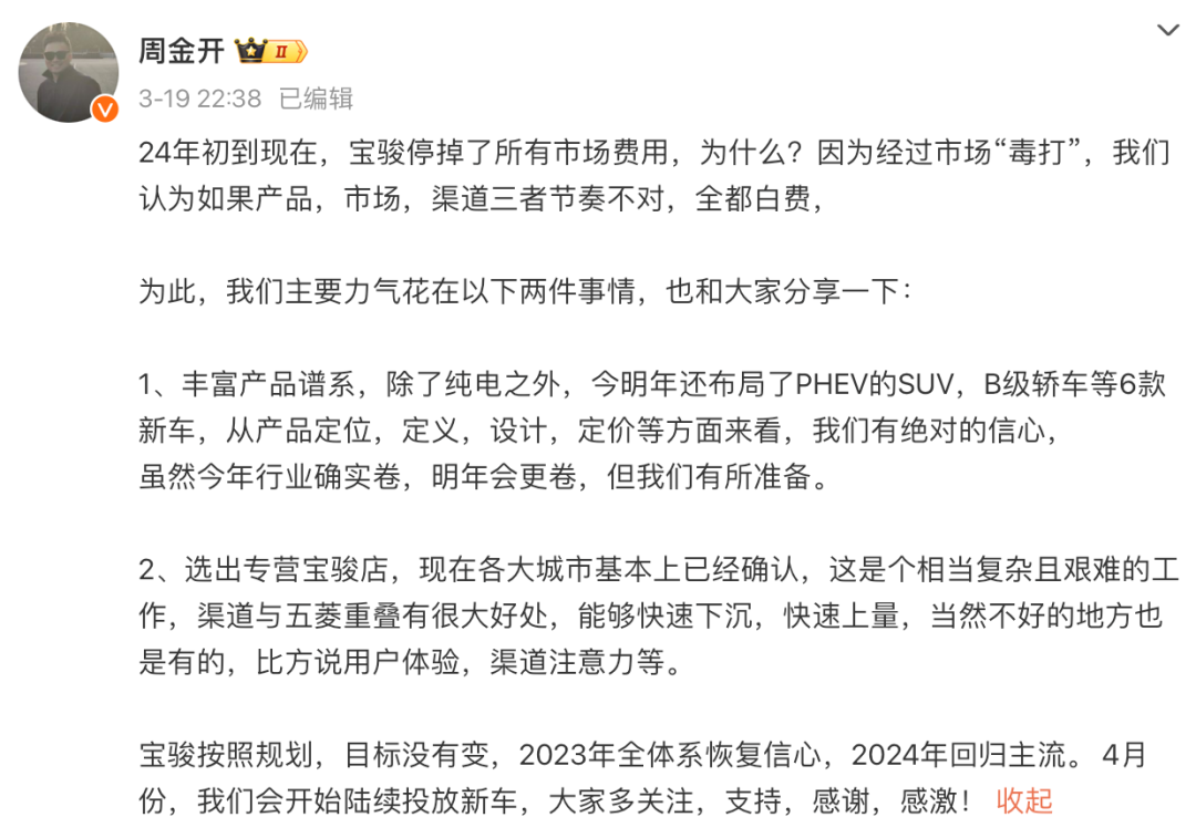 3月19日,周钘在个人微博发布了一则“反思帖”:“24年初到现在,宝骏停掉了所有市场费用,为什么?因为经过市场‘毒打’,我们认为如果产品,市场,渠道三者节奏不对,全都白费……”