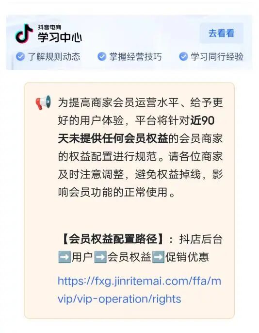根据抖音电商学习中心发布的公告,平台将对开通会员体系半年以上,但近90天内未提供任何会员权益的会员商家的权益配置进行规范。