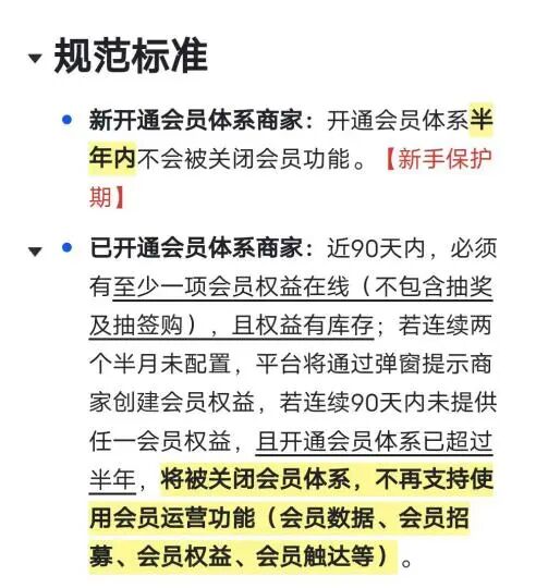 这就意味着已经开通会员体系的商家在近90天内,必须有至少一项会员权益在线(不包含抽奖及抽签购),且权益有库存。