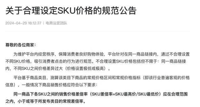 而这一新规主要针对的是商家在商品链接中设置不合理的SKU价格行为,根据该规定,同一商品链接内的不同SKU之间的价格差异不得过大(价格设置极低或极高)。