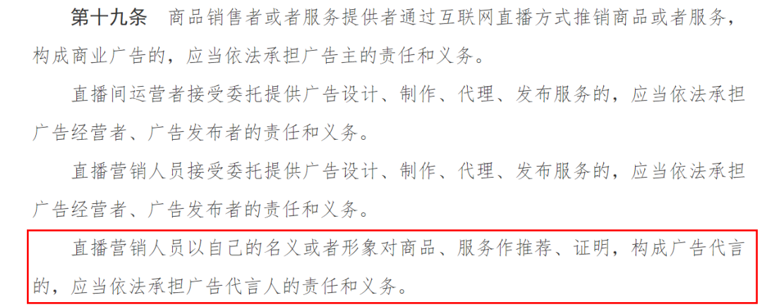 去年5月1日起,由市场监管总局修订发布的《互联网广告管理办法》正式实施,明确了利用网络直播形式发布互联网广告时各方参与主体的责任,其中“直播营销人员以自己的名义或形象作推荐、证明,构成广告代言的,承担广告代言人责任。”
