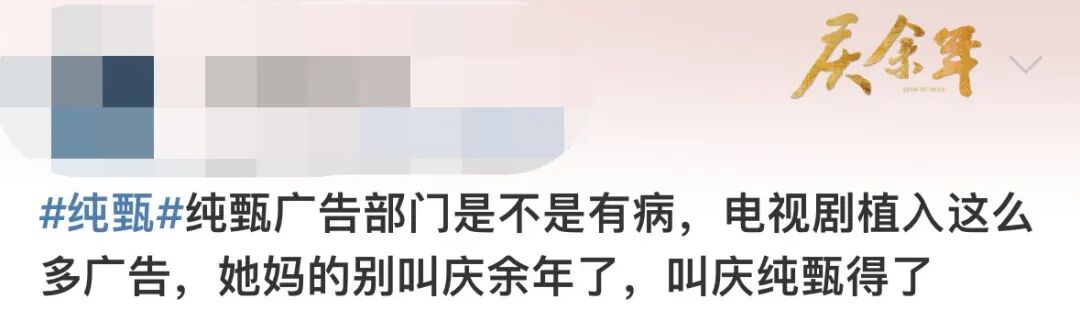相反,由于《庆余年2》的广告太多,已经备受观众诟病,引发舆论反噬。有人表示,《庆余年》不如干脆改名叫《庆纯甄》。