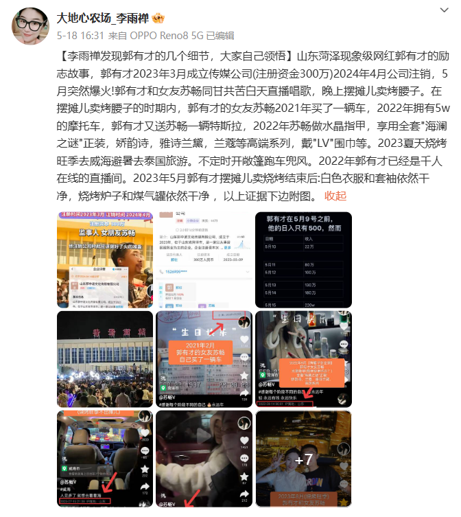 他还称郭有才并非真正的草根出身,其曾在2023年注册了一家注册资金为300万的传媒公司——山东郭中道文化传媒有限公司,而这家公司在今年4月被注销了。