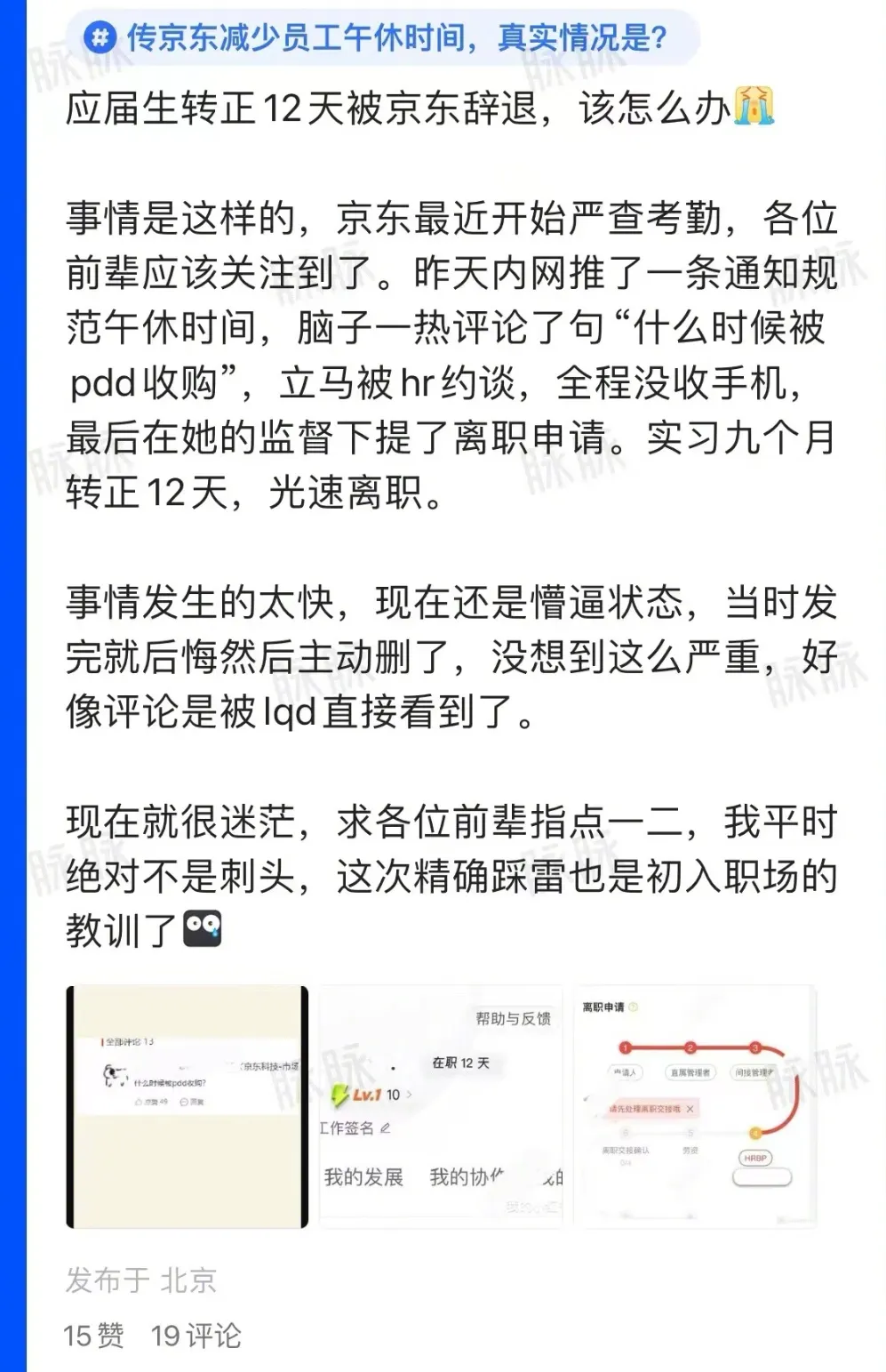 日前,有位上海交通大学的毕业生在网上发布了一篇文章称:“京东近期开始严查考勤,昨天内网推送了一条通知以规范午休时间,我脑子一热评论了句‘什么时候被pdd收购’,结果立马就被hr约谈,全程手机被没收,最后在其监督下提交了离职申请。实习九个月转正仅12天,就光速离职了。”