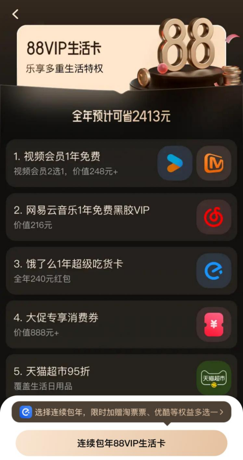 公开资料显示,88VIP的权益主要包括天猫超市等直营平台折上95折,同时还联动饿了么、优酷等阿里生态体系内的权益及网易云音乐、夸克网盘等。