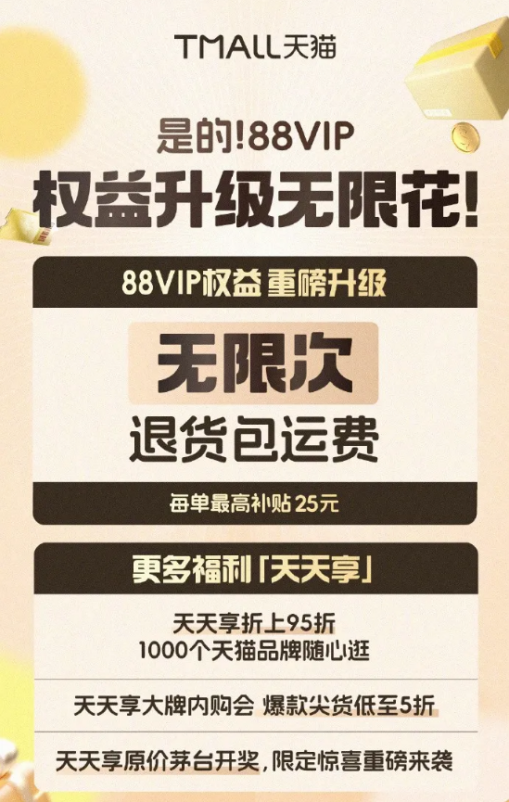 就在一个月前,淘宝官宣88VIP退货运费权益升级,原来每月6张5元退货运费券权益升级为每单最高补贴25元,不限次数且可以和运费险叠加使用。淘宝此举,基本为消费者在线上购物扫除了后顾之忧。