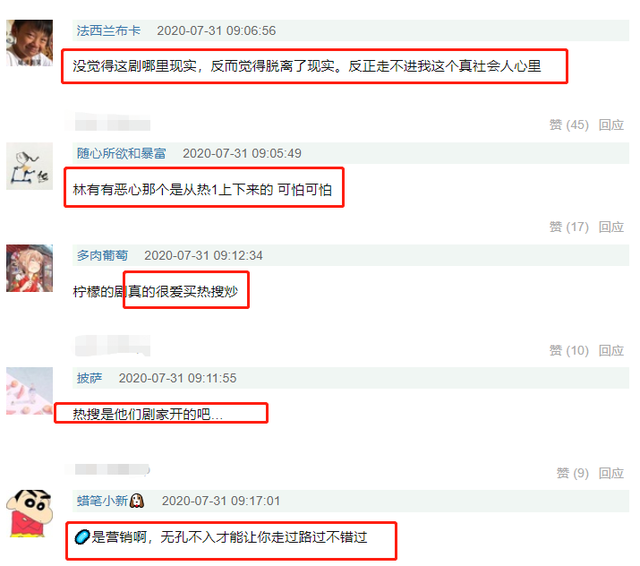 也有人认为,《三十而已》刚开播时确实非常吸引人,随着剧情的深入,渐渐开始脱离现实,总的来说,《三十而已》确实是一部不错的电视剧,7月31日上午,热搜上有10个与《三十而已》有关的热搜,究竟是真的火了还是营销呢?7月31日上午,电视剧《三十而已》同时上了十个热搜,热搜位置一共有50个,《三十而已》单凭7月30日的剧情就可以占据热搜位置的五分之一,确实是非常厉害。在7月30日的剧情中,许幻山出轨林有有,观众们在网络上掀起了议论骂战,纷纷指责许幻山是“渣男”,林有有是小三,与此同时,顾佳什么时候能离婚也是网友们关心的重点,好朋友王漫妮也决定回到老家,这一系列剧情都让观众牵肠挂肚。从热搜上来看,热搜前20有5个与《三十而已》中的人物和剧情有关,“林有有动摇了凌玲在我心中的位置”占据了热搜榜首,有两条与许幻山有关的,分别是“许幻山开始嫌弃顾佳”和“许幻山山渣”,看得出来,许幻山的人气还是很高的。在第21位热搜到第50位热搜中,与《三十而已》相关的有5个,其中有大部分与其中的人物感情线有关,除此之外,“三十而已亲情”也在预备热搜上。《三十而已》的热搜如此之多,网友们纷纷感慨,都不用看剧,直接看热搜就知道剧情进行到哪里了,江疏影的个人新媒体指数排第二,《三十而已》的电视剧播放指数排第一,火是真的火,但是营销也是真的多,单凭借网友的讨论上不了这么多的热搜。以目前的热搜为例,“林有有恶心”这个话题排21位,点开之后发现,该话题的阅读量为5.9亿,讨论量为10万。排在热搜第41位的《重启》,话题阅读量6.6亿,讨论量为46.4万,各方面的数据差距明显,很难让人相信“林有有恶心”这个话题是网友自然刷上去的。对此,很多网友吐槽说:“没觉得这剧哪里现实,反而觉得脱离了现实。反正走不进我这个真社会人心里”“林有有恶心那个是从热1上下来的,可怕可怕”“柠萌的剧真的很爱买热搜炒”“热搜是他们剧家开的吧”“无孔不入才能让你走过路过不错过”。该剧播出至今,热搜数量超132个。总结下来,《三十而已》凭借“太太团”这一话题事件获取关注,之后在丰富的剧情推动下,点燃了该剧的全民讨论热度。不管是营销还是真的火,《三十而已》的话题讨论度确实很高,基本上是同时段播出的电视剧中的第一,路人盘确实很大,不过目前确实有人质疑过这部剧高开低走,从目前的剧情来看还不至于,希望之后的发展不会为了拔高立意而强行改变人物性格吧。