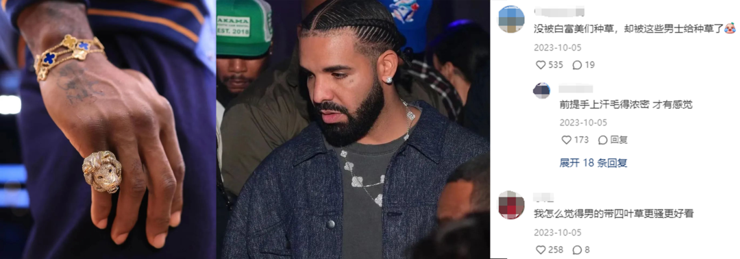 2022年,说唱歌手Drake、篮球巨星詹姆斯,先后叠戴梵克雅宝出街,一向被盖章女性化的四叶草,以反差感俘获一众潮男,变成有钱有品有格调的魅力男人象征,网友感慨:“没被白富美们种草,却被这些男士种草了。”