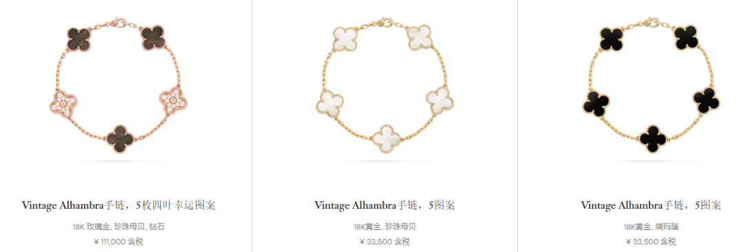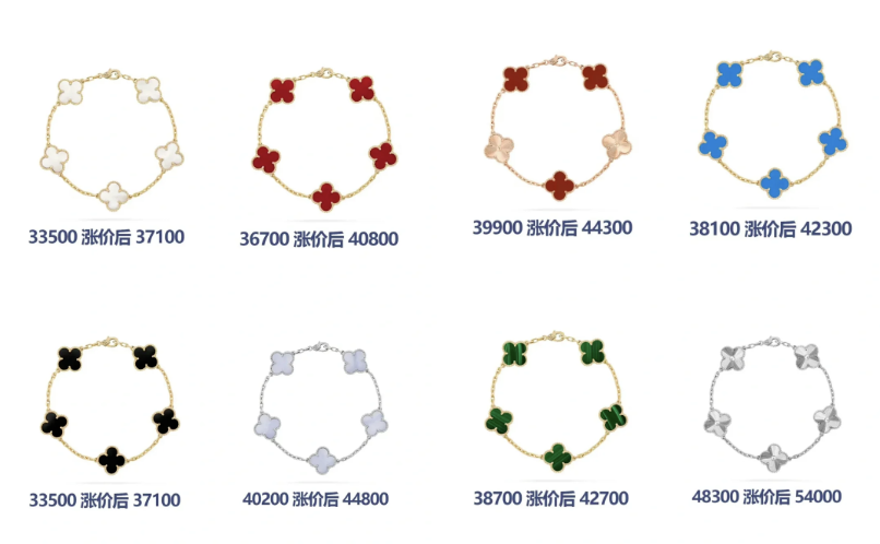 有消息称,梵克雅宝中国市场预计于5月31日涨价,且涨幅高达11%,当家爆款“五花手链”(有5枚四叶草图案)也在其列,现在卖36700元的“红五花”明天涨到40800,现在卖48300的“铂金五花”明天直接冲到54000;日本市场则预计于下月4日涨价,平均涨幅在7.5%左右,五花手链涨幅或高达14%至15.5%。