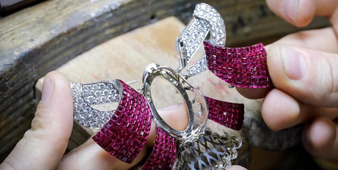 1933年,梵克雅宝发明了一种“隐密式镶嵌工艺”(Mystery Setting)工艺,奥秘在于金质轨道的运用。需要8小时才能切割打磨好的宝石,一颗一颗细细密密镶嵌在轨道中,明面上看不出任何固定宝石的金属爪,是为“隐秘”。