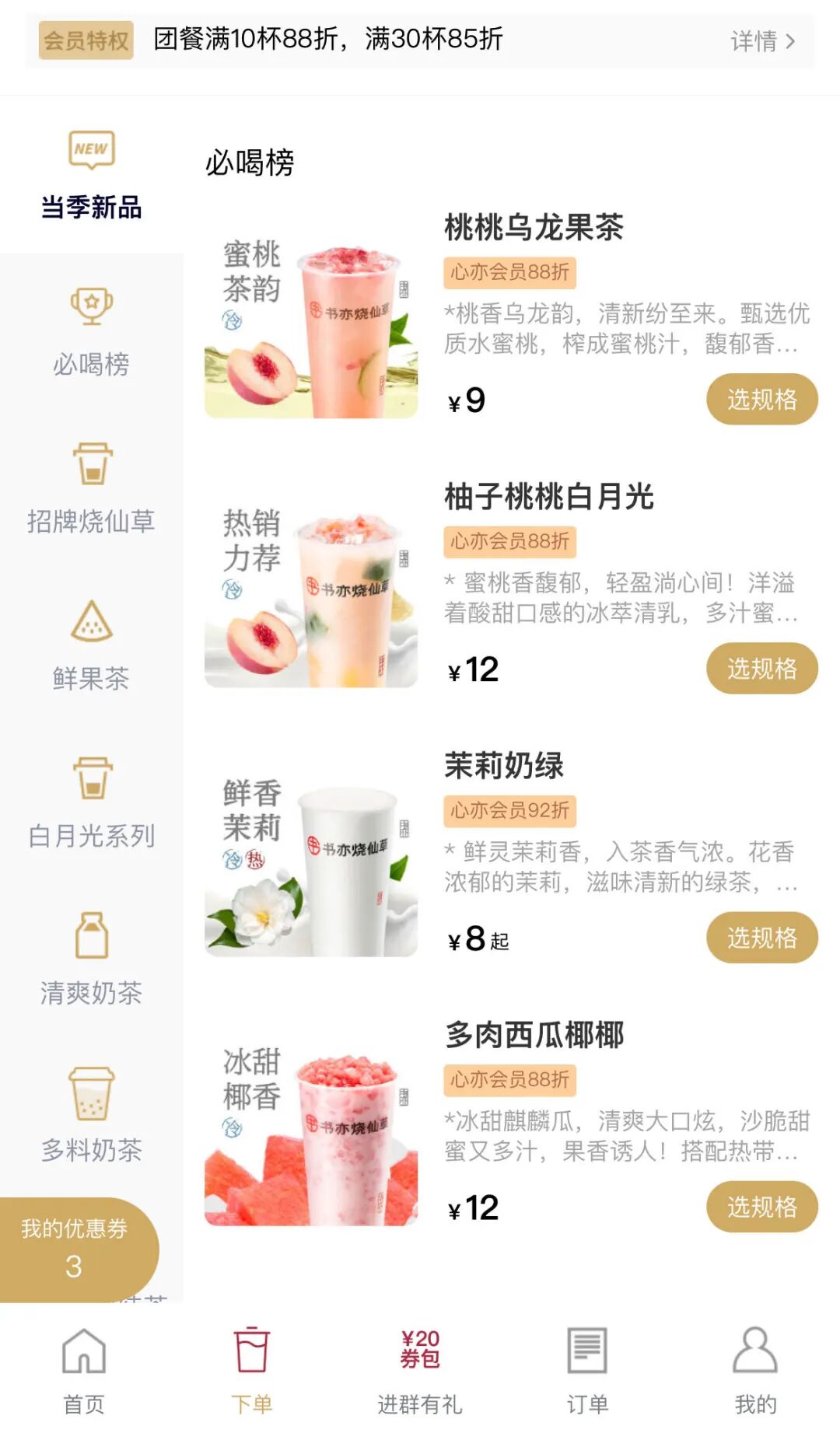 同时,书亦还将菜单里“茉莉奶绿”“幽兰乌龙”等产品进行了调价,由原先的12元调整到现在8元,在产品侧彻底做到了性价比满满。