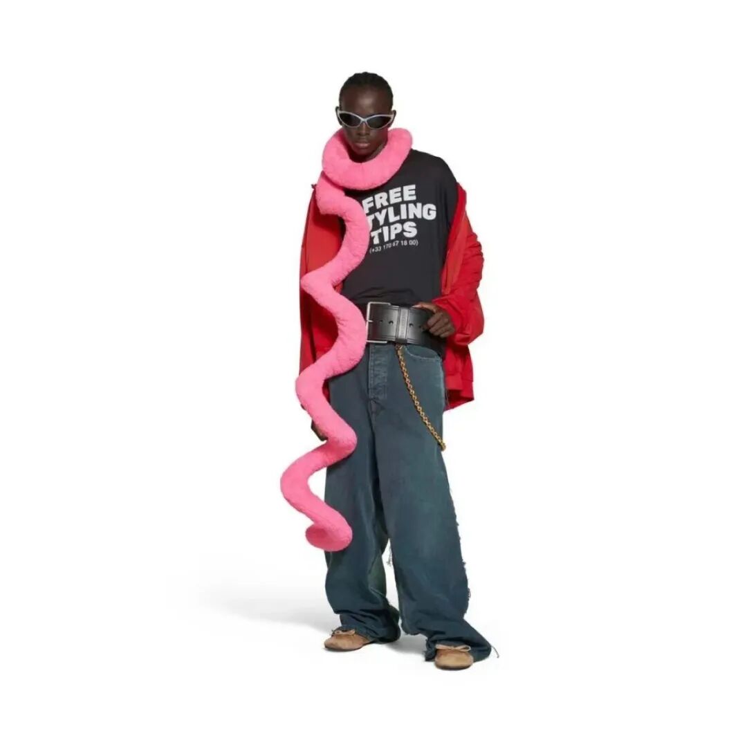 再看挂脖子的单品——价值1.7w的魔性围巾,真不知道如何做到,既像毛毛虫又像扭扭薯条的,还像一坨屎。