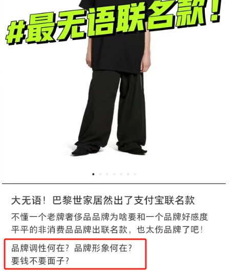 有网友从品牌调性来审视两者联名,认为巴黎世家和支付宝出联名款有损形象。