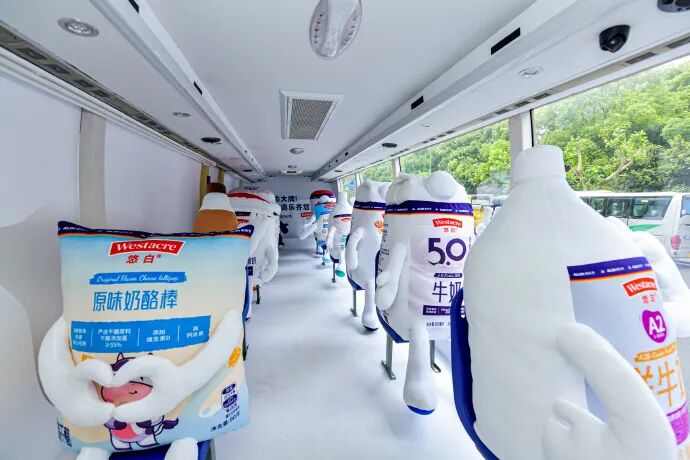 不过此大巴非普通的大巴,而是奥乐齐爆改的专属大巴。原来奥乐齐把大巴设计成牛奶包装盒样子。有意思的是,在奥乐齐的大巴里,大巴还“一本正经”地载着12个cosplay成牛奶的玩偶,不知道的还以为是真的乘客。