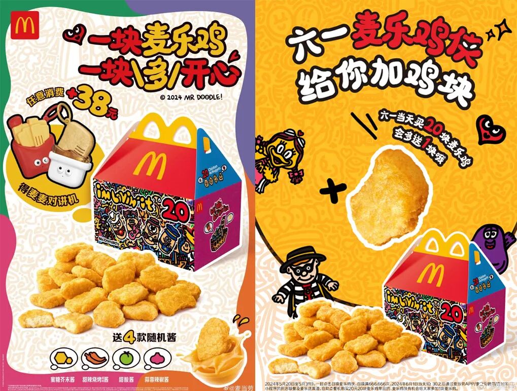 今年六一儿童节,麦当劳彻底玩大了,推出「一块麦乐鸡,一块多开心!」的主题活动,借助“一块”一语双关的内涵,传递“吃一块麦乐鸡”的仪式感,也输出了“跟麦当劳一块开心”的美好寓意。在这样的主题之下,麦当劳从定制玩具、麦乐鸡福利大放送到地铁营销,打造以麦乐鸡为主角的氛围感营销。