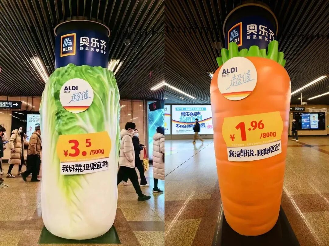 与其说奥乐齐的商战打得有点突然,倒不如说延续了自身叫板友商和巨物营销的策略。此前ALDI奥乐齐杀进静安寺地铁站,打造超大号白菜、胡萝卜、牛奶、可颂的异形包柱装置,配合有梗有趣的文案标语,展开一场显眼包营销:
