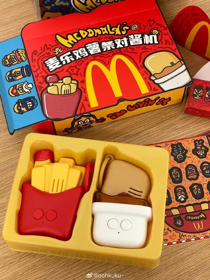 最后麦当劳还推出了玩具——麦麦对讲机,以经典的麦乐鸡和薯条组合为造型,定制更有麦当劳记忆点和辨识度的周边,可谓玩味十足。用户在麦当劳“任意消费+38 元”即可获得对讲机,一经上线后引发抢购热潮,甚至被炒到了300元;配合对讲机推广,麦当劳还上线一支 CGI 动画短片,生动呈现上海网红建筑武康大楼秒变麦乐鸡对讲机的惊喜效果。