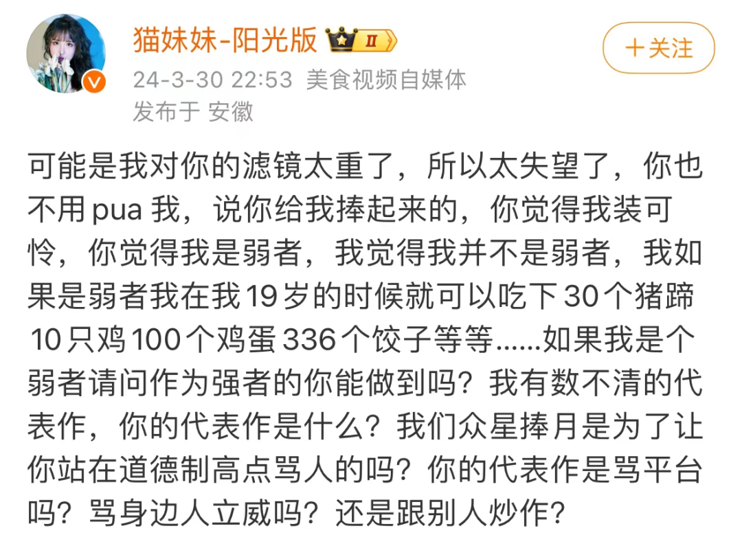 今年3月,曾当过快手一姐的辛巴徒弟“猫妹妹”在微博上发文,疑似抨击师父辛巴,“可能是我对你的滤镜太重了,所以太失望了,你也不用pua我,说你给我捧起来的”,“你的代表作是骂平台吗?骂身边人立威吗?还是跟别人炒作?”。