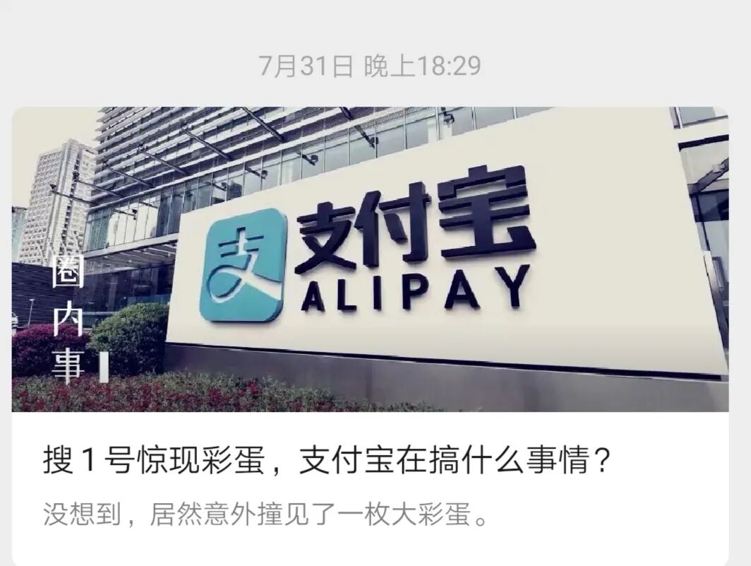 7月31日晚,微信公众号@互联网圈内事发布了一篇标题为《搜1号惊现彩蛋,支付宝在搞什么事情?》的文章,文中所说的支付宝端内的「搜索彩蛋」激起了人们的好奇心。