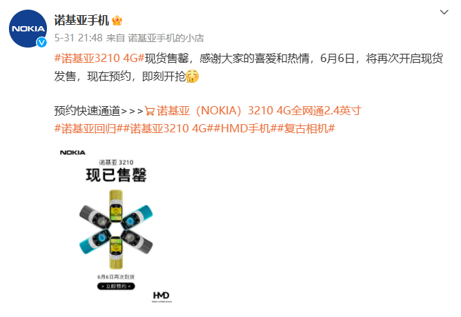 5月31日,诺基亚在微博发布了“现货售罄”的消息,而这已是这款5月8日上市的复刻版经典手机的第二次售罄,第一次发生在这款手机上市2天后的5月10号。